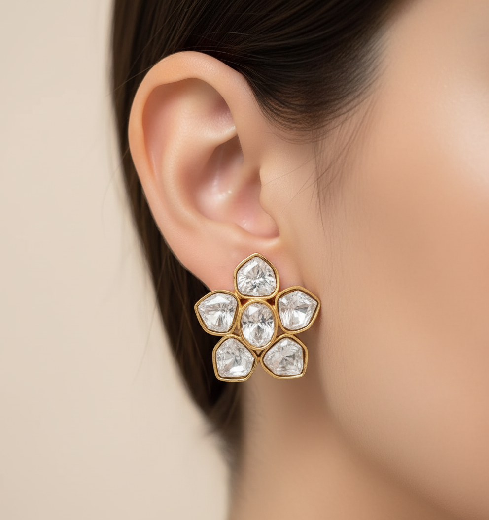All our handcrafted jewelry are made using semi-precious polki and moissanite stones, natural quartz, glass stones, American Diamonds. high quality pearls and kundan which are set in real silver and gold foil..
