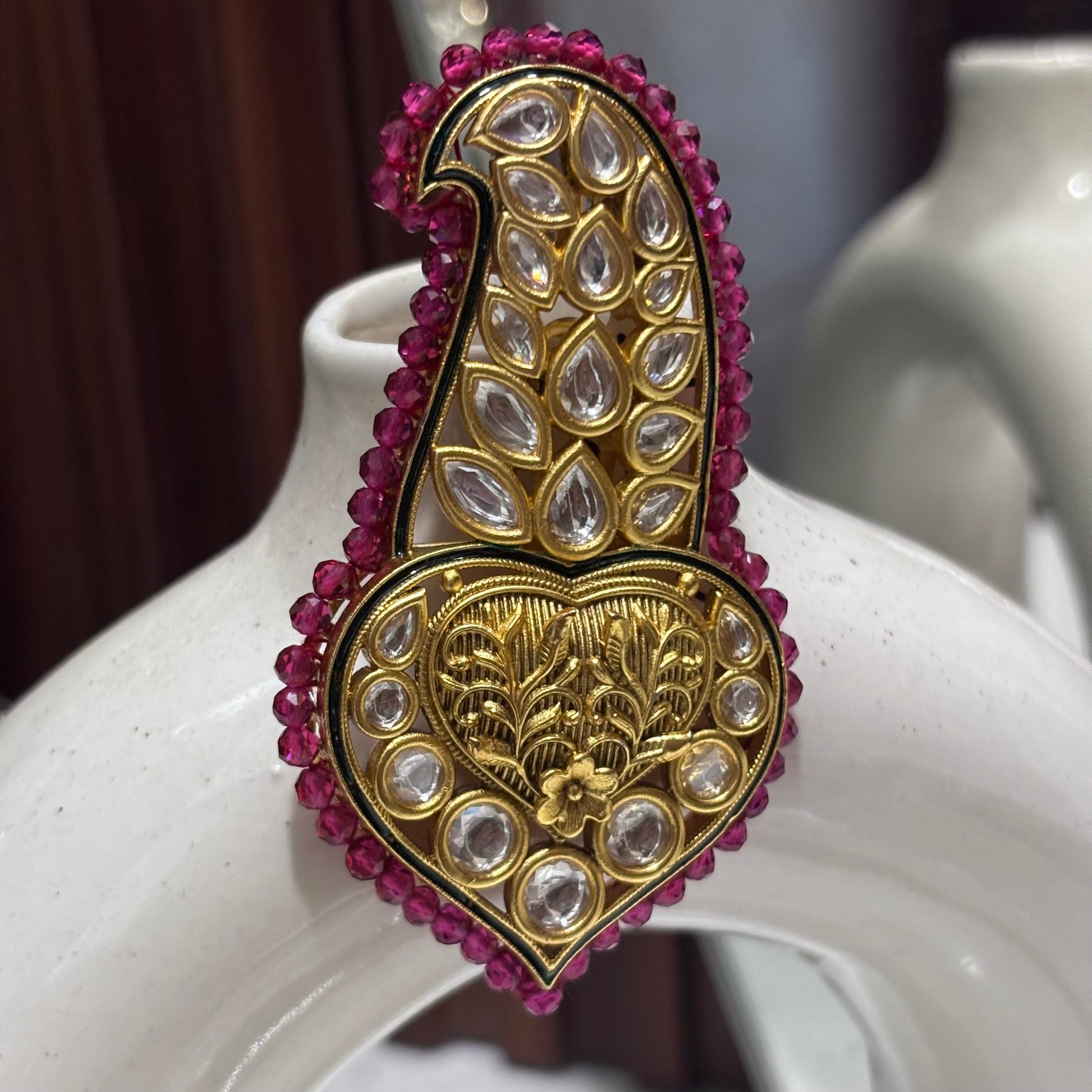 This polki Kalgi or brooch features a timeless handcrafted cuff design adorned with natural stone accents, adding a touch of earthiness to the versatile piece. Perfect for the wedding and festive occasions
