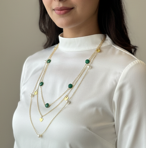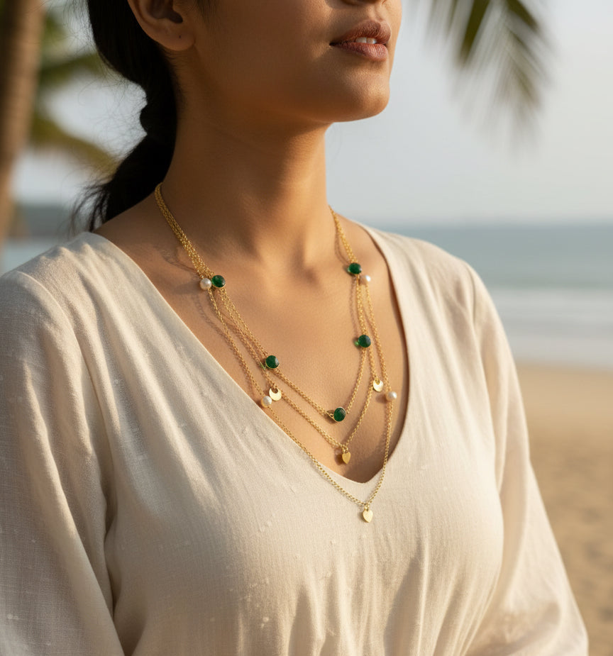 Elevate your Indian or fusion look with the Chic Charms Chain, a unique short stones charm chain made of solid brass adorned with translucent natural stones. Its elegant design enhances your neckline for a polished, exclusive look while making a lasting impact at any event. Discover the ultimate in fashion with the beautiful chain. You can style it with an Indian or Western outfit for a trendy look
