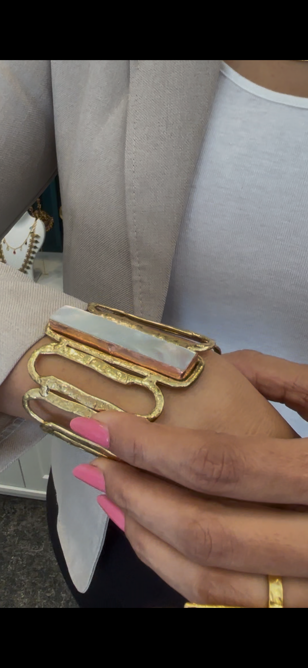 Indulge in the irresistible charm of "Luna Handcuff Bracelet," a stunning wrist cuff expertly crafted from intricately linked beater brass wires and premium shell pearl for a mesmerizing impact. This incredible piece is a must-have for your jewelry collection, with its durability and timeless appeal