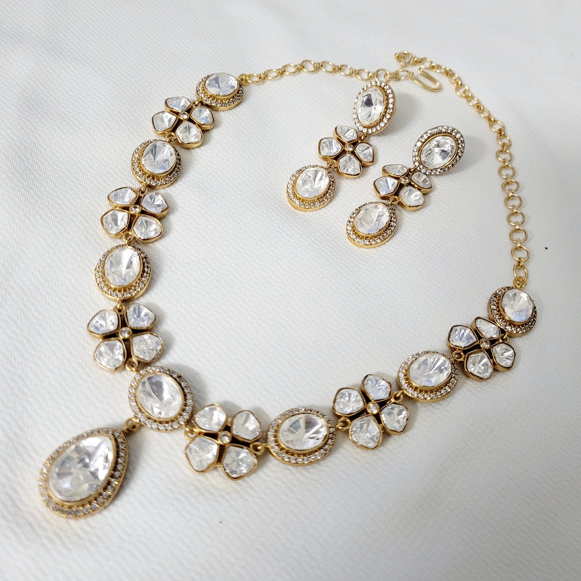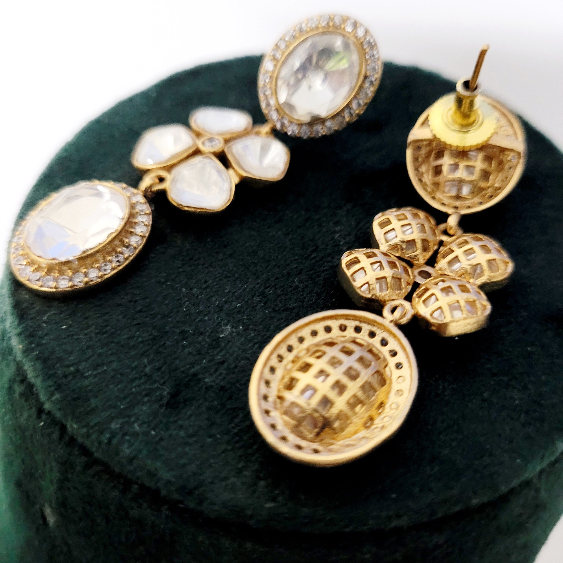 All our handcrafted jewelry are made using semi precious polki and moissanite stones, natural quartz, glass stones, American Diamonds. high quality pearls and kundan which are set in real silver and gold foil